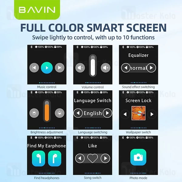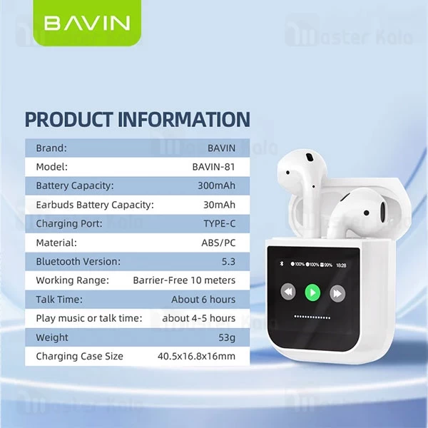 یکی از ویژگیهای منحصربهفرد Bavin Airpod 81، وجود یک صفحهنمایش لمسی هوشمند روی کیس شارژ است. این نمایشگر امکاناتی فراتر از انتظار ارائه میدهد؛ از جمله نمایش درصد باتری، کنترل میزان صدا، قفل صفحه، تعویض والپیپر، دسترسی به افکتهای صوتی، حالت عکسبرداری، قابلیت «پیدا کردن ایرباد»، تنظیم روشنایی، و حتی یک دکمه لایک! این صفحهنمایش در هندزفری باوین مدل 81 نقش یک دستیار کامل را ایفا میکند و تجربه کاربری بسیار جذابتری به کاربر میدهد. درواقع با این ویژگی شما فقط یک هندزفری ندارید، بلکه با یک گجت چندکاره طرف هستید.