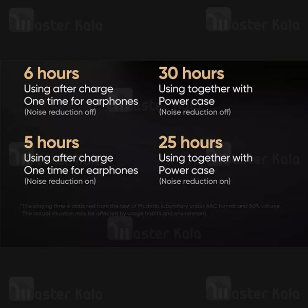 که طبق گفته شرکت مک دودو با شارژ کامل هندزفری و ANC خاموش، حدود 6 ساعت هندزفری ها و حدود 24 ساعت کیس شارژ و مجموعا 30 ساعت قابلیت استفاده است. مقدار نگه داشتن شارژ در هنگام روشن بودن ANC مقداری فرق کرده و به 5 ساعت برای گوشی ها و 20 ساعت کیس شارژ و مجموعا 25 ساعت قابل استفاده است. قابل ذکر است برای پر شدن شارژ هندزفری به حدود 1.5 ساعت شارژ نیاز است.