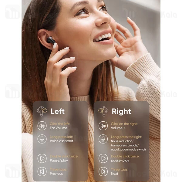 با لمس و نگه داشتن گوشی سمت چپ به مدت چند ثانیه دستیار صوتی را فعال خواهید کرد و با لمس و نگه داشتن گوشی سمت راست می توانید حالت حذف نویز هوشمند را روشن و میان سه حالت حذف نویز سویچ کنید.