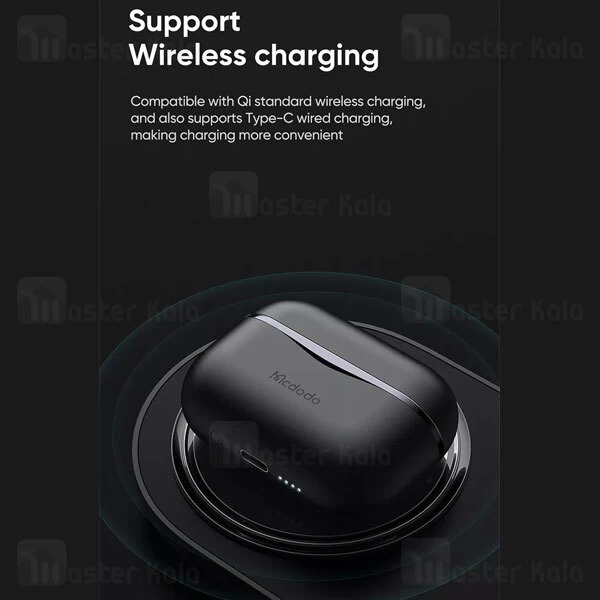 هندزفری بلوتوث مک دودو HP-8010 از قابلیت شارژ وایرلس (QI) پشتیبانی می کند و شما می توانید به صورت بی سیم این هندزفری را شارژ کنید؛ بعلاوه شما به صورت سیمی و با استفاده از درگاه تایپ سی که در قسمت پاینی کیس وجود دارد می توانید این هندزفری را شارژ کنید.