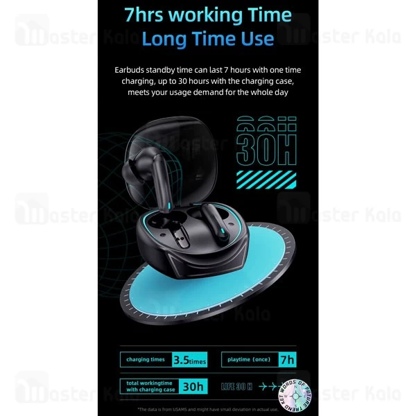 در هندزفری یوسامز IA04 یک باتری بسیار قدرتمند مورد استفاده قرار گرفته است. در نتیجه تنها با یک بار شارژ باتری هندزفری خود، میتوانید با شارژ کردن کیس شارژ خود، به مدت 30 ساعت از آن استفاده کنید. همچنین بدون کیس نیز میتوانید 7 ساعت از هندزفری گیمینگ یوسامز IA04 هندزفری استفاده کنید. شما میتوانید این هندزفری را به کمک کابل Type-c که در جعبه محصول قرار گرفته، شارژ کنید.