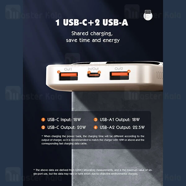 ظرفیت اسمی این پاوربانک، معادل 10000mAh است؛ ولی باید توجه داشته باشید که متناسب با ولتاژ گوشی شما این ظرفیت تغییر خواهد کرد.