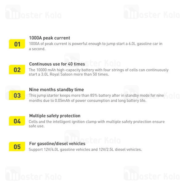 پاوربانک بیسوس CGNL020101 با توانایی تولید جریان اوج 1000 آمپر و جریان لحظهای 500 آمپر قادر است خودرو را در کوتاهترین زمان ممکن روشن کند. این ویژگی در مواقعی که باتری خودرو کاملاً خالی شده یا در هوای سرد دچار مشکل شده است، اهمیت ویژهای دارد.