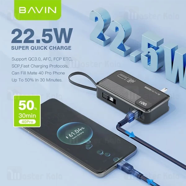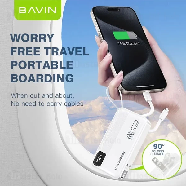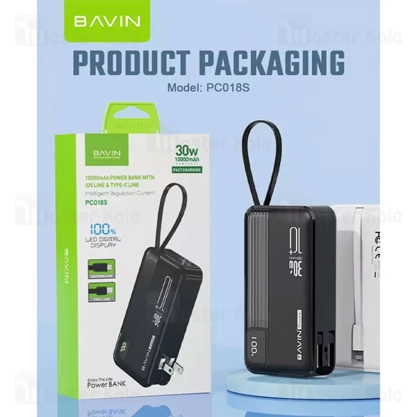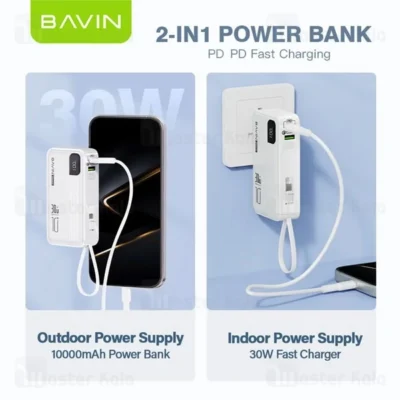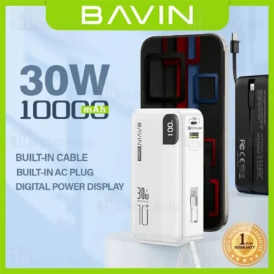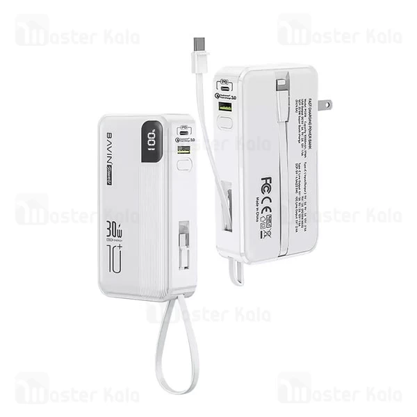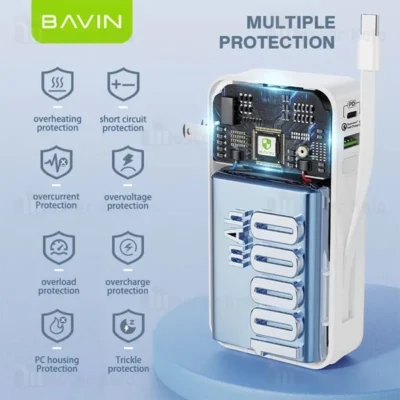 پاوربانک 10000 باوین Bavin PC018S توان 30 وات همراه با کابل و دو شاخه متصل