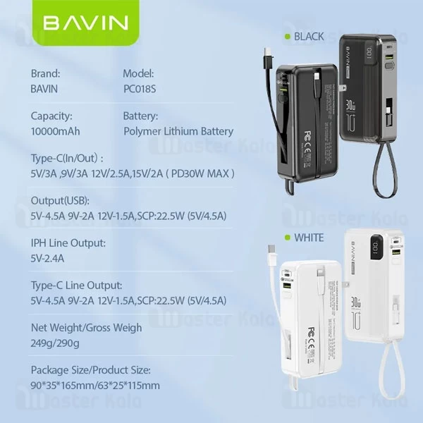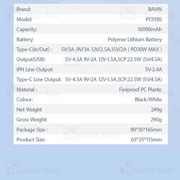 مشخصات پاوربانک 10000 باوین Bavin PC018S توان 30 وات