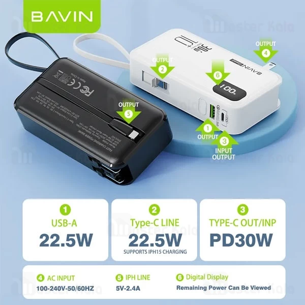 پاوربانک باوین PC018S یک کابل متصل تایپ C دارد که از آیفون 15 را نیز پشتیبانی می کند.یک کابل متصل IPH دیگر نیز در قسمت پشتی آن قرار دارد.همچنین یک خروجی USB-A نیز در کناره ی پاوربانک تعبیه شده است.کنار این خروجی یک پورت تایپ C وجود دارد که هم به عنوان خروجی و هم به عنوان ورودی استفاده می شود.