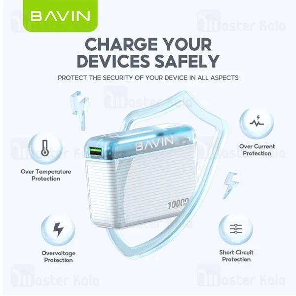 پاوربانک 10000 باوین PC1021 دارای مکانیسم محافظت از دستگاه های در حال شارژ (شارژ ایمن) است. محافظت از دمای بیش از حد، محافظت از ولتاژ بیش از حد و محافظت از جریان بیش از حد از اصلی ترین پروتکل های حفاظتی پاوربانک Bavin PC1021 است.