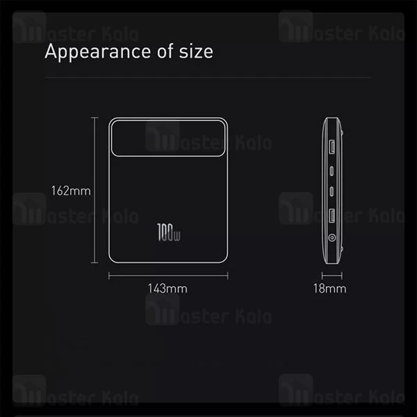 پاوربانک فست شارژ بیسوس PPBLD100-X Blade از پلاستیک محکم و مقاوم ABS و PC ساخته شده و دارای ابعاد 162*143*18 میلی متری می باشد. وزن این پاوربانک حدود 490 گرم می باشد. بعلاوه این محصول دارای صفحه نمایش دیجیتالی بوده که شما می توانید میزان شارژ پاوربانک را با آن مشاهده کنید. این پاور بانک به گونهای طراحی شده است که اثر انگشتی روی آن باقی نمیماند و میتوانید بدون نیاز به پاک کردن مداوم مورد استفاده قرار گیرد.