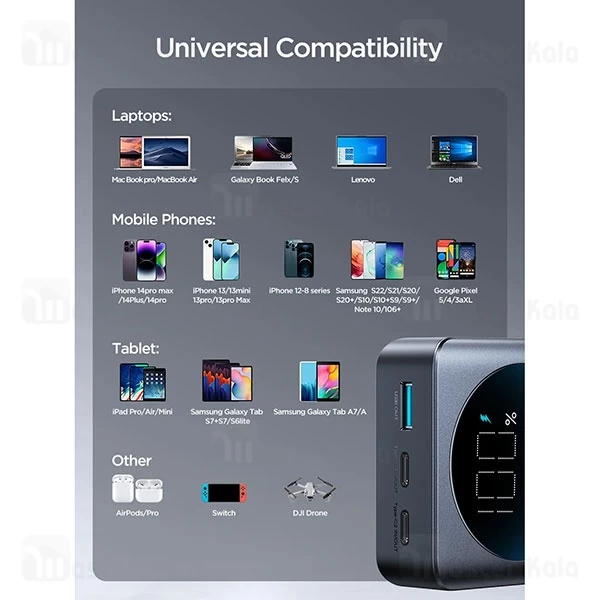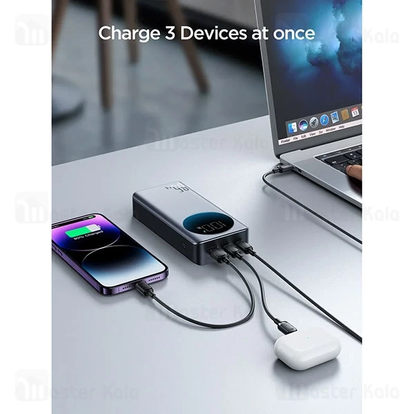 وجود دو خروجی USB-C و یک خروجی USB-A در پاوربانک Joyroom JR-PBF04 این امکان را فراهم میکند که همزمان سه دستگاه مختلف را شارژ کنید. توان مجموع خروجی تا 95 وات میرسد و حتی در استفاده همزمان نیز افت محسوسی در سرعت یا عملکرد شارژ مشاهده نمیشود. بنابراین شما میتوانید گوشی، هدفون بیسیم و تبلت خود را بهطور همزمان و سریع شارژ کنید، که این ویژگی بهویژه برای خانوادهها یا کاربرانی با چند دستگاه بسیار کاربردی است.