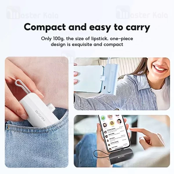 در ساخت پاوربانک Bavin PC012 Pro از پلاستیک با کیفیت از جنس پلی کربنات ضد آتش ساخته شده است. ابعاد پاوربانک Bavin PC012 Pro برابر 7.5*2.5*4.5 بوده که ابعادی مناسب برای حمل در انواع کولهها و کیفها است. وزن 126 گرمی نسبت به بسیاری از گزینههای رقیب سبکتر است. یک کابل USB در قسمت بالای این پاوربانک قرار گرفته که شما را از حمل کردن کابل اضافی بینیاز میکند و میتوانید به کمک آن پاوربانک خود را شارژ کنید.