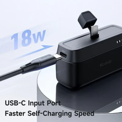 بر روی بدنه پاوربانک Mcdodo MC-6302 یک پورت و یک کانکتور Type-c تعبیه شده که میتوانید از کانکتور به منظور شارژ تلفن همراه و از پورت به منظور اتصال پاوربانک به شارژر استفاده کنید.