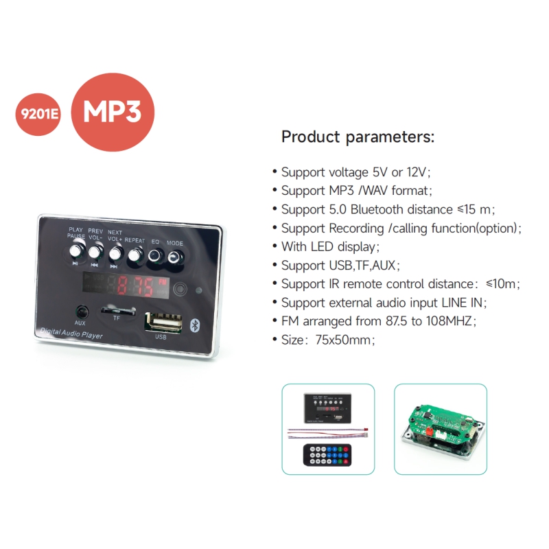این پخش کننده MP3 با قابلیت بلوتوث همچنین دارای قابلیتهای دیگری نیز هستند، مانند رادیو FM، ضبط صوت، شکاف کارت حافظه برای ذخیره فایلهای MP3 و خروجی صوتی جهت اتصال به آمپلی فایر و بلندگوها میباشد.