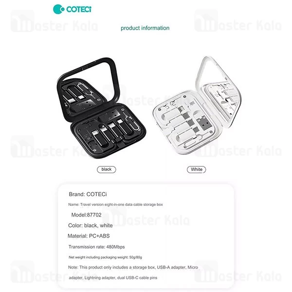 پک کابل چند منظوره Coteetci 87702 وزنی حدود 52 گرم دارد که به راحتی میتوانید آن را حمل و نقل کنید. جنس این محصول از پلاستیک محکم ABS و PC بوده است. داخل پک کابل چند منظوره کوتتسی 87702 یک کابل تایپ سی به تایپ سی با طول 30 سانتی متر، یک تبدیل لایتنینگ (آیفونی)، یک تبدیل USB، یک تبدیل میکرو (Micro USB) و یک سوزن سیم کارت وجود دارد.