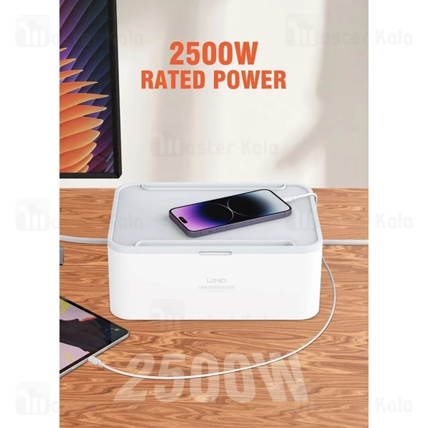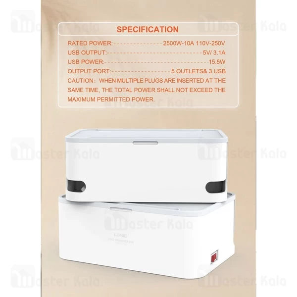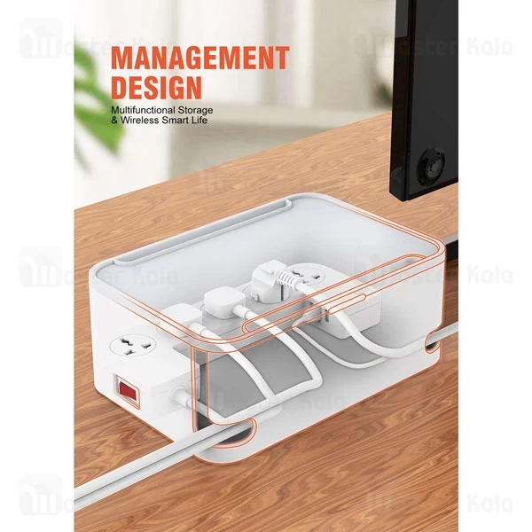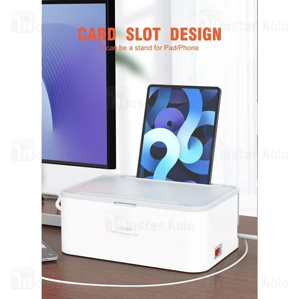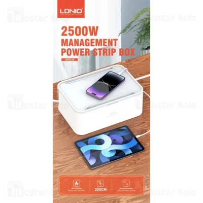 مهمترین ویژگی چند راهی برق الدینیو SN5310 که در نگاه اول به چشم شما میخورد، وجود یک جعبه دور پریزها و پورتهای شارژ است. وجود این باکس کمک میکند که دیگر سیمهای دستگاههای مختلف در محیط زندگی شما پخشوپلا نباشد. در نتیجه نه سیمها و دوشاخهها آسیب میبینند و نه فضای خانه شما شلوغ و بینظم میشود. دو شیار L مانند نیز در دو گوشه بدنه این دستگاه قرار گرفته که کمک میکند بتوانید سیمهای برق را از آن عبور کنید و به شکلی منظم از آنها استفاده کنید. بر روی در این باکس نیز یک شیار وجود دارد که میتوانید آیپد و یا گوشی خود را از ان عبور داده و گوشی خود را داخل باکس به شارژ بزنید.