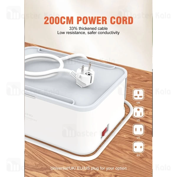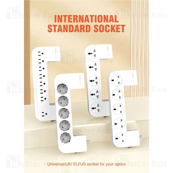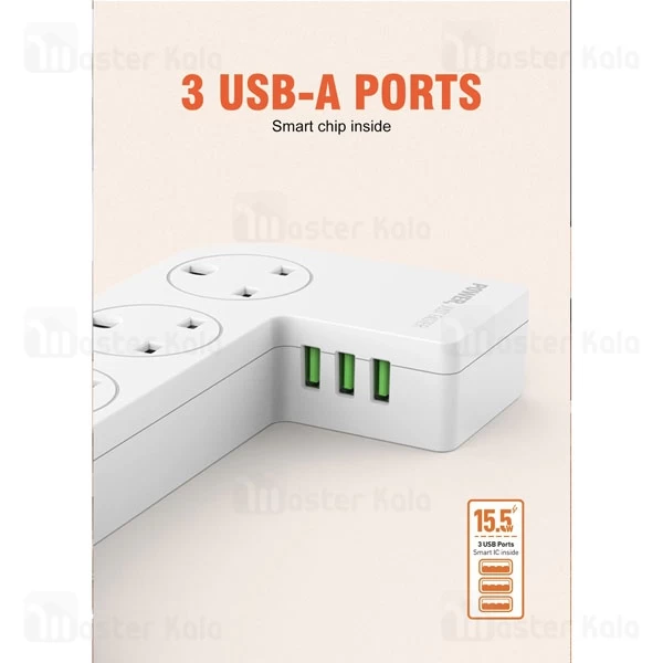 این چند راهی 3 پورت شارژ و 5 پریز برق EU دارد. همچنین از برق شهری تغذیه میکند. پورتهای شارژ این چند راهی از نوع USB بوده و مجهز به فناوری Auto-ID هستند. در نتیجه بسته به توان مورد نیاز برای شارژ دستگاه شما، میزان خروجی پورتها تنظیم میشود. توان هر سه این پورتها روی هم برابر با 15.5 وات (جریان 3.1 آمپر) است.