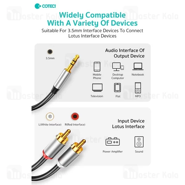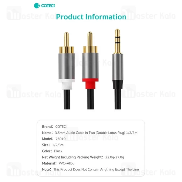 کابل 1 به 2 صدا Coteetci 76010 از ترکیبی از PVC و آلومینیوم ساخته شده که در برابر پارگی و کشیدگی مقاوم است. مهمتر از آن اما اگر جزء آن دسته از افرادی هستید که از گره خوردن کابلها کلافه میشوند، کابل تبدیل صدا کوتتسی 76010 گزینه بسیار مناسبی برای شما است. طول این کابل 2 متر است و در نتیجه بدون دغدغه کم بودن طول کابل میتوانید از آن استفاده کنید. در یک سمت کابل 1 به 2 صدا Coteetci 76010 یک کانکتور AUX قرار داشته و در طرف دیگر دو کانکتور به اصطلاح چپ (با رنگ قرمز) و راست (با رنگ سفید) قرار گرفته که میتوانید آن را به ورودی آمپلیفایر یا بلندگوی خود وصل کنید.
