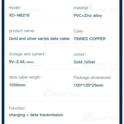کابل آیفونی XO NB216 Lightning Cable Gold And Silver Series Data Cable کابل لایتنینگ XO NB216 با طول 1 متر و حداکثر شدت جریان 2.4 آمپر با سیمی از جنس نایلون بافته شده و کانکتورهایی با نقش برجسته انتخاب مناسبی…