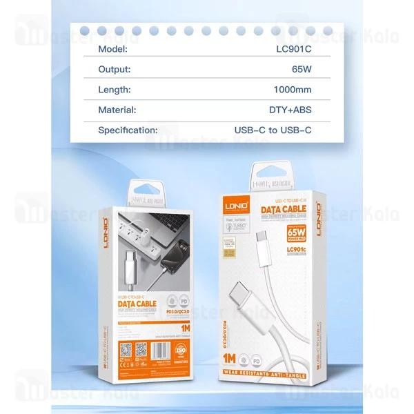 کابل Type-C به Type-c الدینیو LC901C از قابلیت شارژ سریع و انتقال داده برخوردار است. در دو سر این کابل کانکتور Type-C با پوشش پلاستیک قرار داشته که کیفیت بسیار بالایی دارد. سر کانکتورها نیز از آلیاژ آلومینیوم ساخته شده است. بدنه این کابل از جنس ABS بوده که روی طول کابل را نخ از جنس بسیار باکیفیت DTY میپوشاند. این پوشش نخی هم ظاهر بسیار شیک و جذابی داشته و هم در برابر خم شدن و خوردگی مقاوم است. طول کابل Type-C الدینیو LC901C برابر 1 متر است. کابل دو سر Type-C مدل Ldnio LC901C برای انتقال دیتا نیز مناسب بوده و می تواند با حداکثر سرعت 480 مگابیت بر ثانیه دیتا را انتقال بدهد.