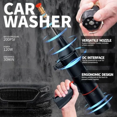 کارواش قابل حمل Fanosys Car Washer BY-XCJ01، دارای کیفیت زیادی بالایی بوده و طراحی ارگونومیک آن استفاده از این ابزار را بسیار ساده میکند. برای استفاده از کارواش Fanosys Car Washer BY-XCJ01 تنها کافی است که پاوربانک قرار گرفته را به پشت کارواش خودرو چسبانده و سپس قطعه مخصوص سری را به سر لوله این محصول بچسبانید تا بتوانید از آن برای شستن خودرو خود اضافه کنید. کارواش قابل حمل Fanosys Car Washer BY-XCJ01 با فشار 1.3 مگا پاسکال آب را به خودرو شما میپاشد. همچنین سری این کارواش 6 حالت دارد. شما با نصب این سری بر روی کارواش Fanosys Car Washer BY-XCJ01 و تغییر محل قرارگیری آن بر سر کارواش، به راحتی میتوانید در 6 حالت از این کارواش استفاده کنید. یکی از این 6 حالت، حالت فوم ساز است. همچنین طبق گفته شرکت سازنده به مدت 30 دقیقه میتوانید از کارواش شارژی فانوسیس Car Washer BY-XCJ01 استفاده کنید.
