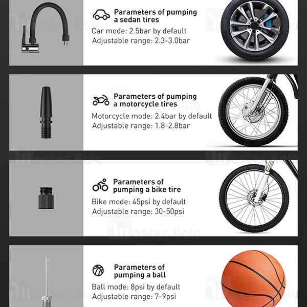 کمپرسور بیسوس فقط مخصوص خودرو نیست. با نازلهای همراه موجود در بستهبندی، میتوانید از آن برای باد کردن موتورسیکلت، دوچرخه یا توپهای ورزشی نیز استفاده کنید. حداکثر فشار برای حالت خودرو 3.0 بار، برای موتورسیکلت 2.8 بار، برای دوچرخه 50 PSI و برای توپ 9 PSI است. به این ترتیب، با یک دستگاه جمعوجور تمام نیازهای شما پوشش داده میشود.