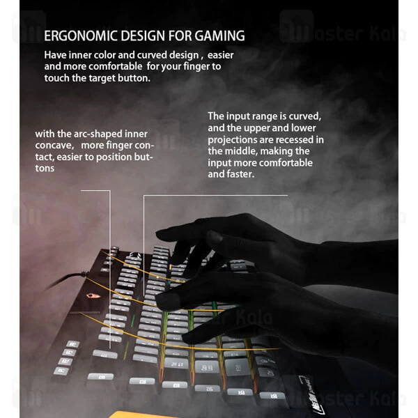 کیبورد سیمی گیمینگ میشن MT-K9420 دارای 104 کلید بوده که کلید ها دارای انحنای کمی هستند و به گونه ای طراحی شده اند که انگشتان روی آن فیکس شده و در استفاده طولانی مدت دست شما خسته نشود. میشن دقیقا تمام دکمه ها را همانجایی که کیبورد استاندارد قرار دارد، قرار داده است و با شیب ملایم خود از خستگی و کند شدن سرعت شما جلوگیری می کند.