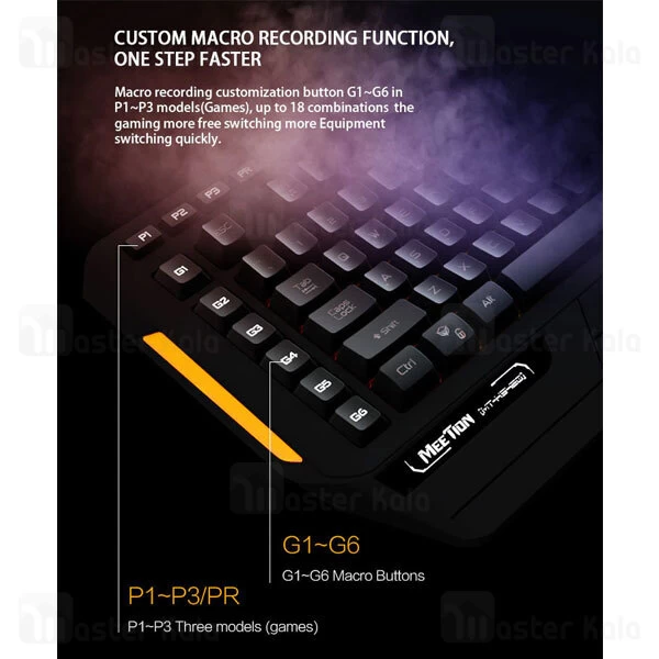 بر روی کیبورد سیمی گیمینگ میشن MT-K9420 دکمه های (6 دکمه G و 3 دکمه P) قرار دارد که می توانید با استفاده از این دکمه ها می توانید حالت های را شخصی سازی کرده و از آن برای کاربری راحتتر (در بازی) استفاده کنید. در کل شما می توانید 18 دستور (3 حالت P برای 6 دکمه G) را برای دکمه ها در نظر بگیرید.