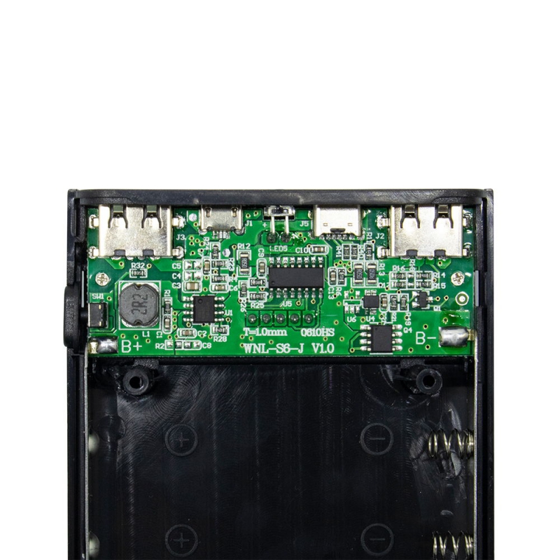دارای قابلیت اتصال 4 عدد باتری لیتیم یون 3.7 ولت ، به همراه برد پاوربانک نمایشگردار و دو خروجی USB